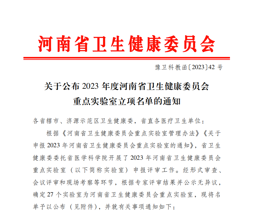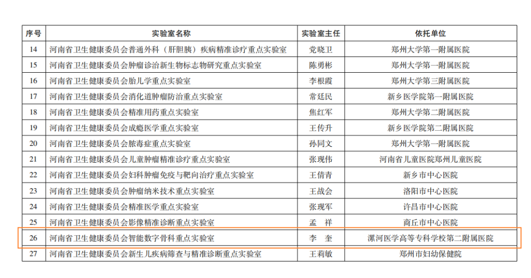 近日,河南省衛(wèi)生健康委員會(huì)公布2023年度重點(diǎn)實(shí)驗(yàn)室立項(xiàng)名單,漯河市骨科醫(yī)院(漯河醫(yī)專二附院)正式獲批建設(shè)河南省衛(wèi)生健康委員會(huì)智能數(shù)字骨科重點(diǎn)實(shí)驗(yàn)室,該項(xiàng)目是醫(yī)院繼2022年獲批建設(shè)省級(jí)工程技術(shù)研究中心后再次獲批建設(shè)省級(jí)重點(diǎn)實(shí)驗(yàn)室。