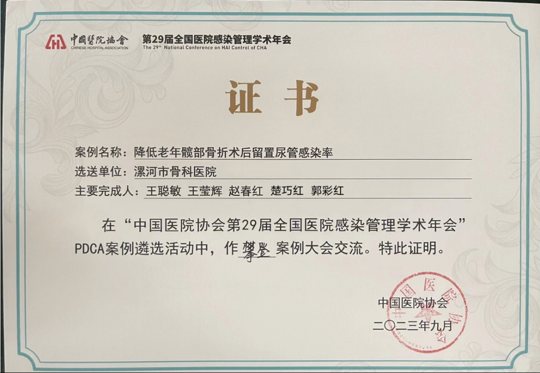 本屆年會(huì)為傳播先進(jìn)理念,展示學(xué)術(shù)成就,設(shè)置了PDCA院感案例交流。會(huì)議共征集全國328個(gè)案例,通過專家函評篩選,遴選出科學(xué)性、實(shí)用性較高的75個(gè)優(yōu)秀案例在全國學(xué)術(shù)比賽現(xiàn)場進(jìn)行交流與展示。其中,由創(chuàng)傷骨科二病區(qū)(骨三科)主要完成的PDCA案例《降低老年髖部骨折術(shù)后留置尿管感染率》在全國大賽上進(jìn)行了精彩展示,并榮獲三等獎(jiǎng)“攀登案例”榮譽(yù)!