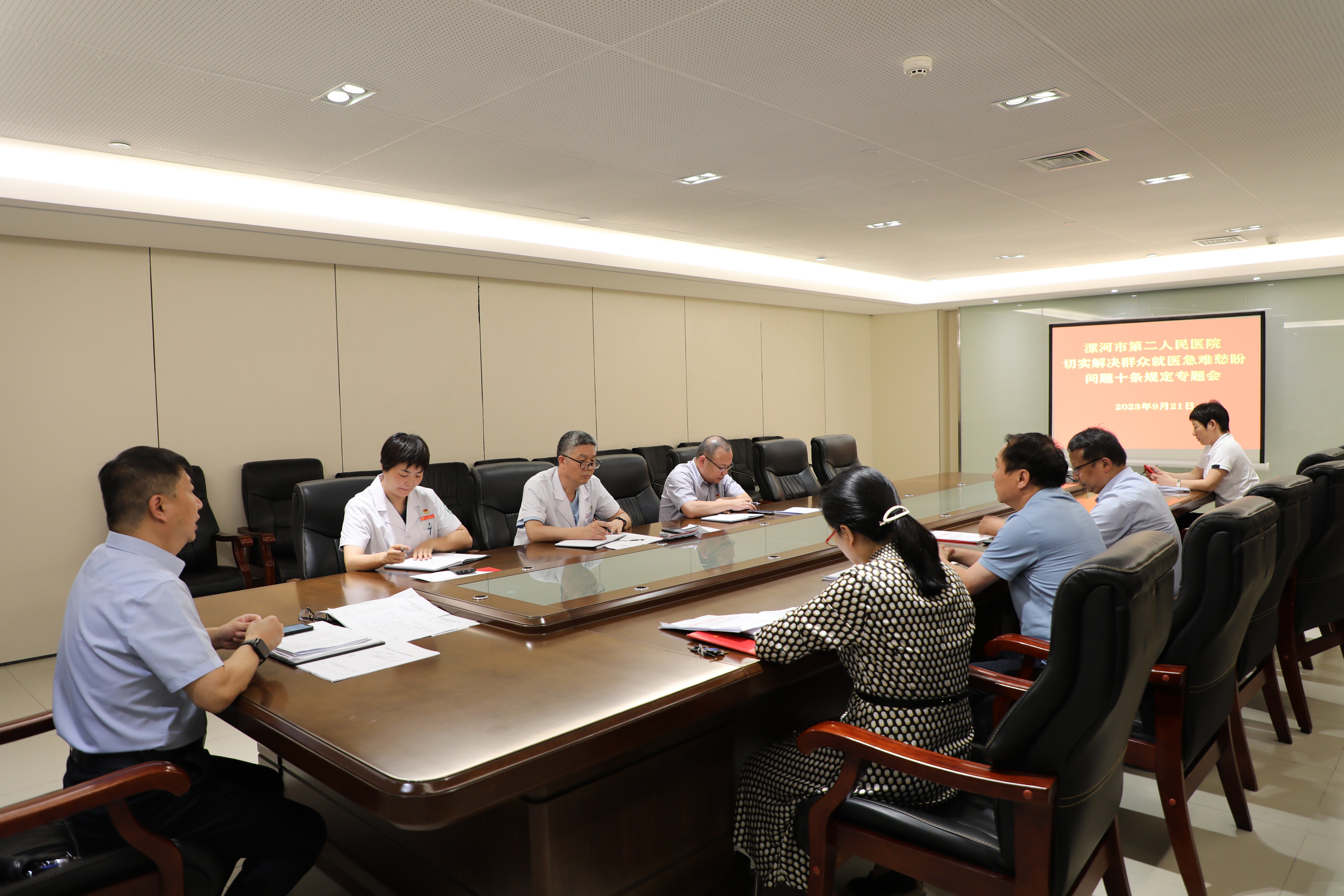 為持續(xù)深入推進(jìn)“ 改善就醫(yī)感受,提升患者體驗(yàn) ”六聚焦六提升行動(dòng),切實(shí)為群眾辦實(shí)事 、解難題,打通人民群眾看病就醫(yī)的堵點(diǎn)淤點(diǎn)難點(diǎn),進(jìn)一步增強(qiáng)人民群眾就醫(yī)獲得感、幸福感、安全感 。9月21日下午,市二院召開切實(shí)解決群眾就醫(yī)急難愁盼問題十條規(guī)定專題會(huì)。黨委書記魏松、院長(zhǎng)王瑾等領(lǐng)導(dǎo)班子成員及職能科長(zhǎng)參加了本次會(huì)議。
