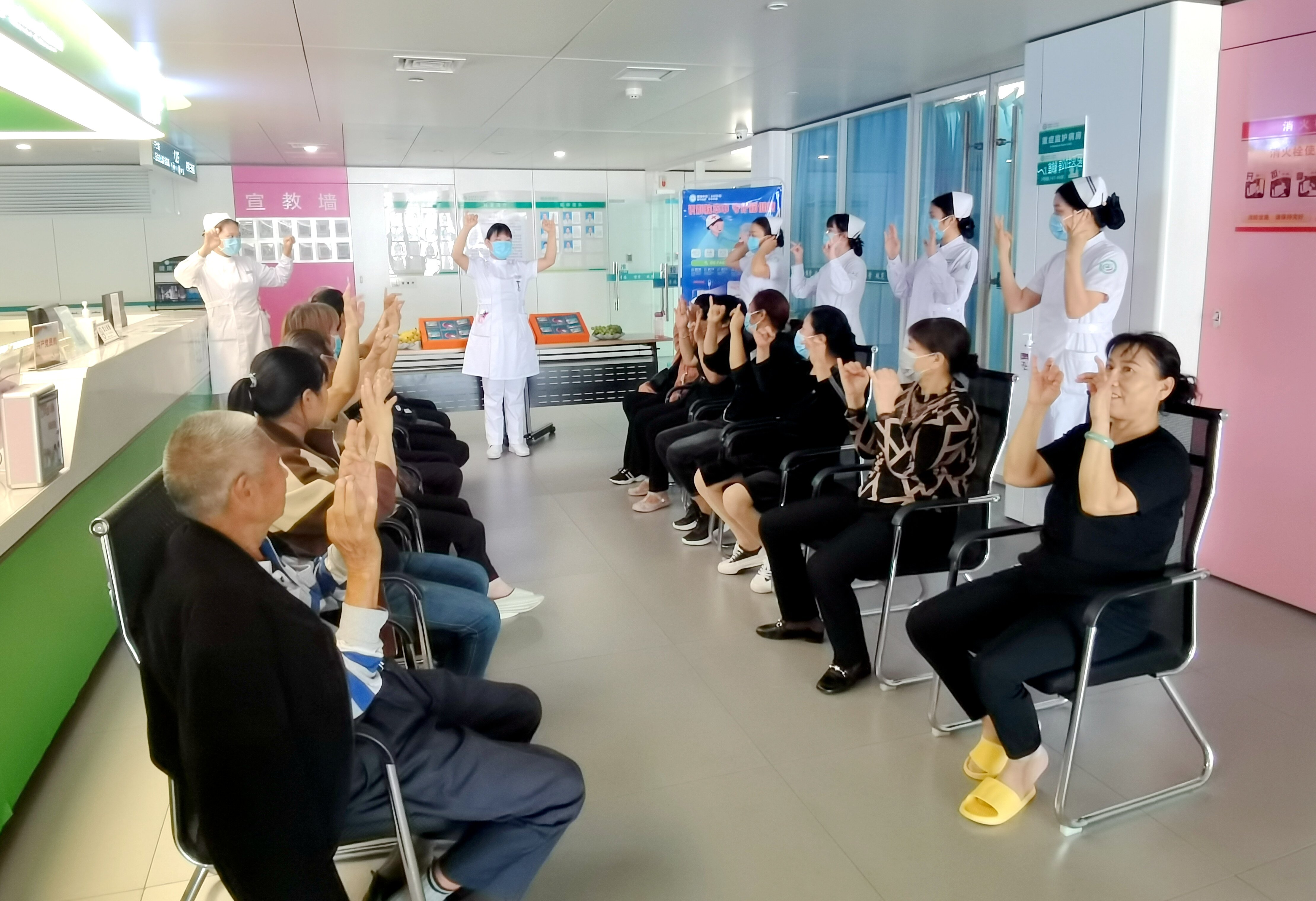 隨后,活動進(jìn)入第一個(gè)環(huán)節(jié):學(xué)習(xí)健腦手指操,旨在通過手指的靈活運(yùn)動,鍛煉患者的心、腦、手、口的協(xié)調(diào)性,讓大腦皮層得到刺激,減緩大腦衰老,對老年癡呆可起到一定的預(yù)防和延緩作用。在護(hù)士長徐曉爽、護(hù)士寇思蕊、宋曉艷、孟嬌、魏杏杏老師的帶領(lǐng)和指導(dǎo)下,患者及家屬紛紛跟著一起做健腦手指操,大家熱情極高,拉近了醫(yī)患的距離。