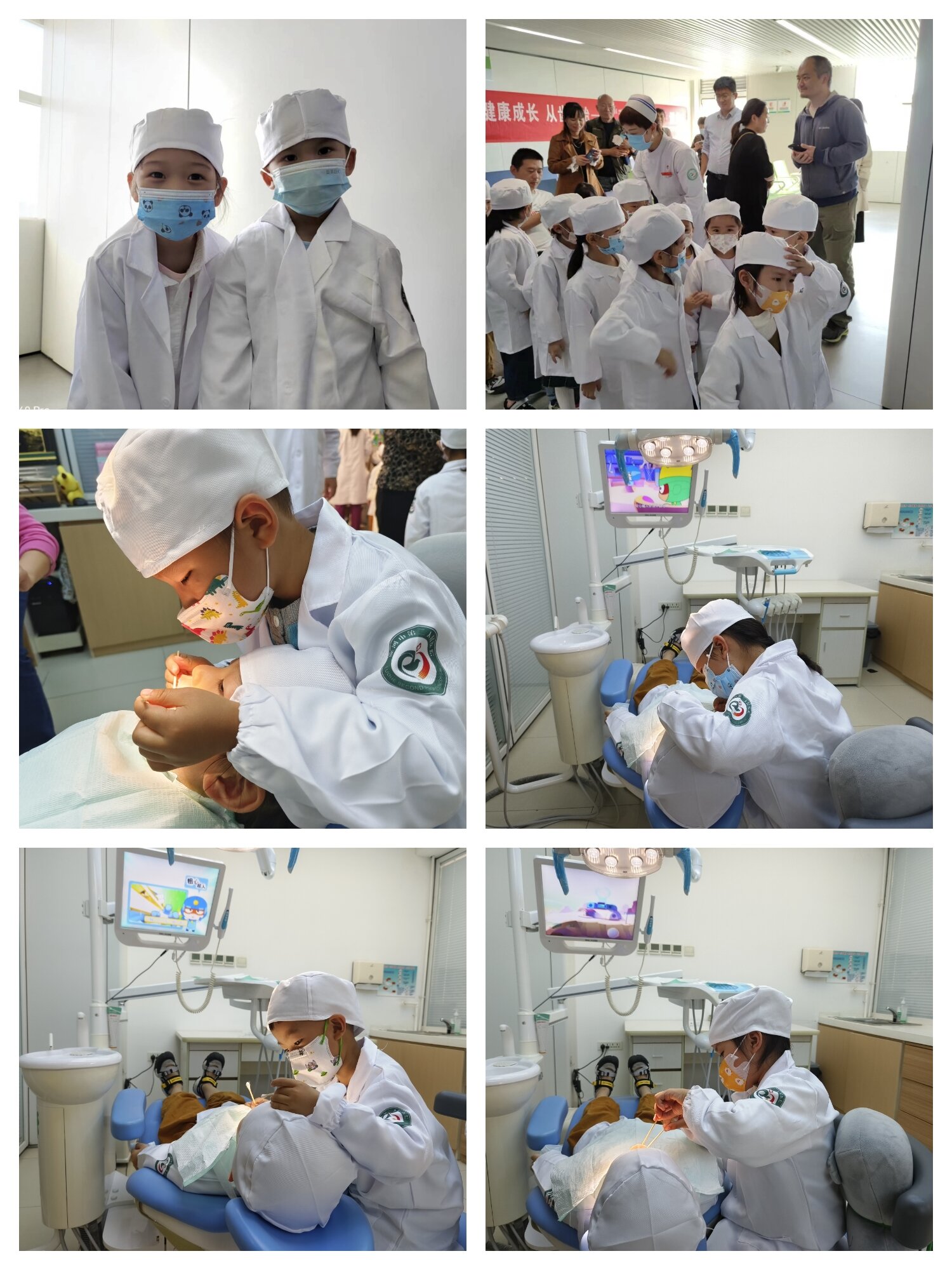 走進醫(yī)院,口腔科的叔叔阿姨們一早在門口等候孩子們的到來,并為他們準備了嶄新的工作服,孩子們幸福地換上白大褂,秒變小牙醫(yī)。口腔科副主任劉學軍、護士長周翔對孩子們的到來表示熱烈歡迎。