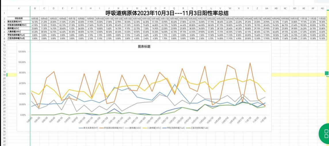 為應對兒童就診高峰,市二院全面落實市衛(wèi)健委要求,在迅速增設病區(qū)、增開白天及夜間兒科專家門診同時,醫(yī)院檢驗科、兒科、急診等相關科室統(tǒng)計了10月以來呼吸道病毒檢驗數(shù)據(jù)及結(jié)果,分析發(fā)現(xiàn)10月17日后平均每日送檢量約是之前的兩倍,提示呼吸道感染患者較前翻倍趨勢。支原體感染陽性率逐日攀升,至10月22日達到頂峰,陽性率最高達57.7%,之后呈逐漸下降趨勢。大約同時期,甲型流感/乙型流感陽性率開始上升,并于10月31日達到陽性率頂峰,分別為24.7%和23.4%。往年乙型流感陽性率極低,今年陽性率與甲流持平,提醒我們需要同時對流感保持警惕。呼吸道合胞病毒與人鼻病毒陽性率一直普遍較高,如呼吸道合胞病毒陽性率最高達98.3%。
