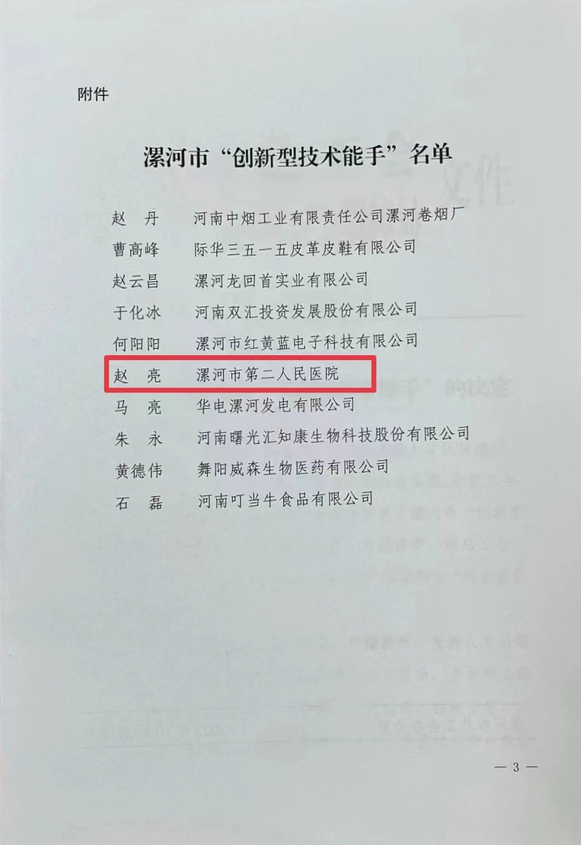 近日,漯河市人力資源局和社會保障局、漯河市總工會聯(lián)合印發(fā)《關(guān)于命名漯河市“創(chuàng)新型技術(shù)能手”的決定》(漯工文[2023]51號),經(jīng)過基層推薦、專家評審,全市10名同志受到表彰,其中市二院放療科副主任趙亮榮獲漯河市“創(chuàng)新型技術(shù)能手”稱號。