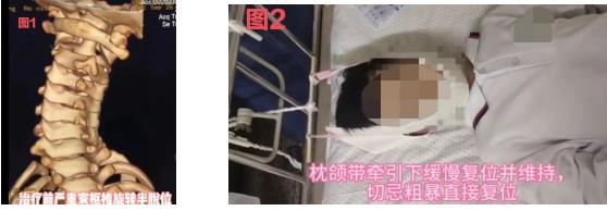 兒童寰樞椎半脫位早期治療并不復(fù)雜,關(guān)鍵時(shí)要高度重視及時(shí)就診正規(guī)治療,切勿亂投醫(yī),勿要不正規(guī)盲目簡單粗暴快速手法復(fù)位。要盡早至脊柱???,診斷明確后一般不需要輸液、抽血等不必要檢查,通常應(yīng)用枕頜帶(Glisson)平臥位取正中位牽引(見圖2),傷后2天內(nèi)盡可能持續(xù)小重量牽引,牽引過程中會緩慢糾正寰樞椎半脫位,牽引重量實(shí)用骨科學(xué)建議兒童約1.5-2kg即可,一般1-3天復(fù)位,兒童表現(xiàn)為頸部旋轉(zhuǎn)功能恢復(fù),疼痛消失??蛇M(jìn)一步復(fù)查X線或CT了解復(fù)位情況,盡可能牽引1-2周。然后可以進(jìn)一步頸托固定保護(hù)約1月為宜。治療不及時(shí)發(fā)生旋轉(zhuǎn)固定半脫位或嚴(yán)重陳舊半脫位,會導(dǎo)致頸疼、斜頸、斜視、面部不對稱,保守?zé)o效時(shí)需要手術(shù)治療。當(dāng)然我們盡可能要避免這種結(jié)局。