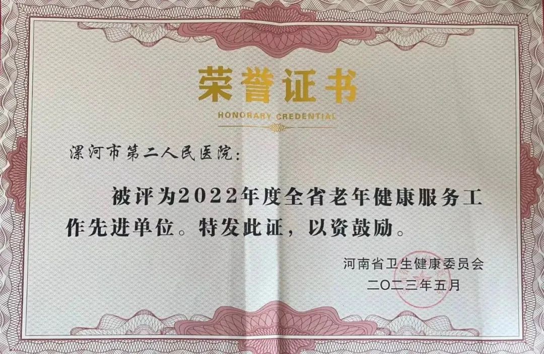 5月31日,河南省衛(wèi)生健康委發(fā)布關(guān)于表彰2022年度全省老齡工作和老齡健康工作先進(jìn)單位、先進(jìn)個人的通報,市二院榮獲“2022年度全省老年健康服務(wù)工作先進(jìn)單位”殊榮。