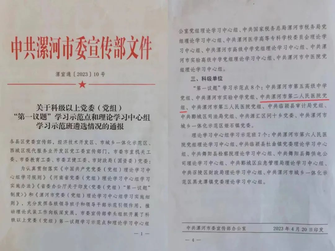 4月26日,市二院黨委被市委宣傳部確定為“第一議題”學(xué)習(xí)示范點(diǎn)稱號。