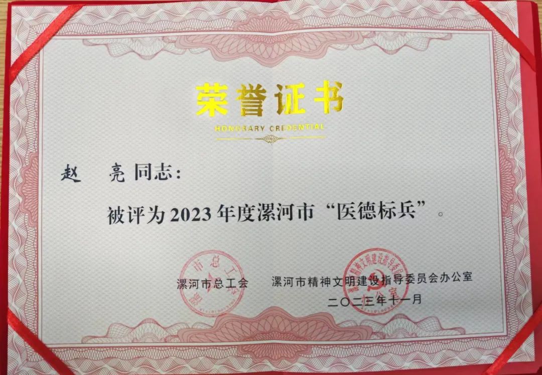 近年來,趙亮先后榮獲“漯河市五一勞動(dòng)獎(jiǎng)?wù)?rdquo;“漯河市職工職業(yè)道德建設(shè)十佳職工”“漯河市青年崗位能手”“漯河市優(yōu)秀醫(yī)師”等榮譽(yù)。一直以來他以白求恩、林巧稚為榜樣,恪守職業(yè)道德,廉潔自律,文明行醫(yī),全心全意為患者提供優(yōu)質(zhì)服務(wù),深受廣大患者尊敬和好評(píng)。