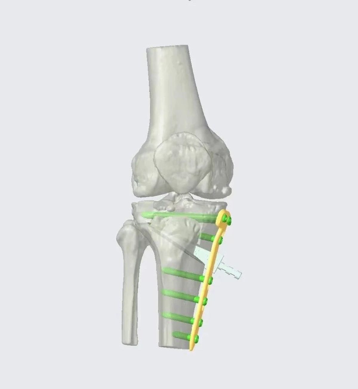 鋼板位置、螺釘位置及長(zhǎng)度均可通過(guò)術(shù)前規(guī)劃計(jì)算,術(shù)中通過(guò)定位操作,基本與術(shù)前規(guī)劃一致,手術(shù)快速高效完成,外側(cè)合頁(yè)保留完整。無(wú)任何并發(fā)癥出現(xiàn)。術(shù)后見(jiàn)鋼板位置及力線糾正近乎完美!
