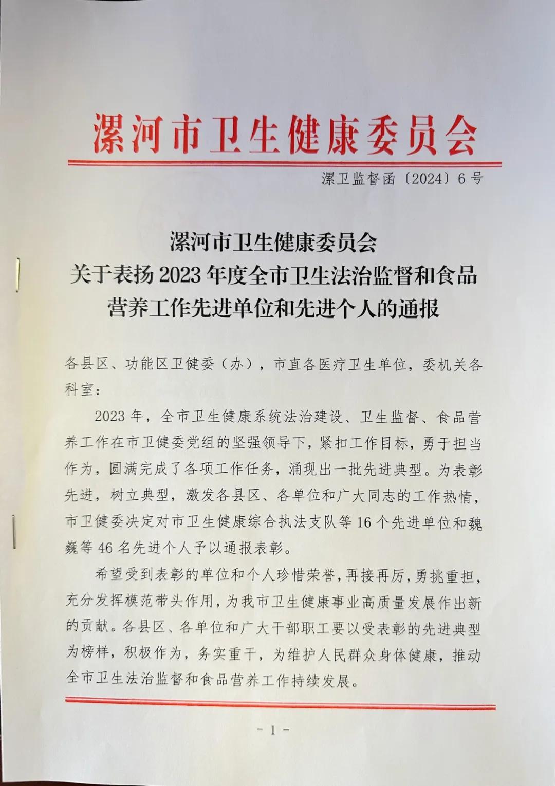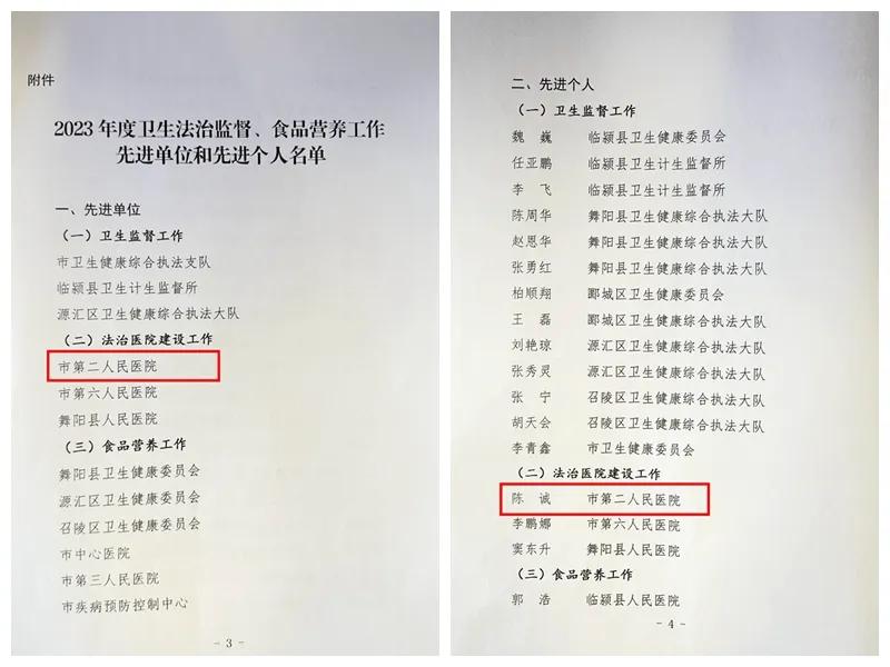 在3月20日召開的2024年度全市疾病預防控制、衛(wèi)生法治監(jiān)督暨食品營養(yǎng)工作會議上,市二院榮獲2023年度全市法治醫(yī)院建設(shè)工作先進單位,陳誠榮獲全市法治醫(yī)院建設(shè)工作先進個人。