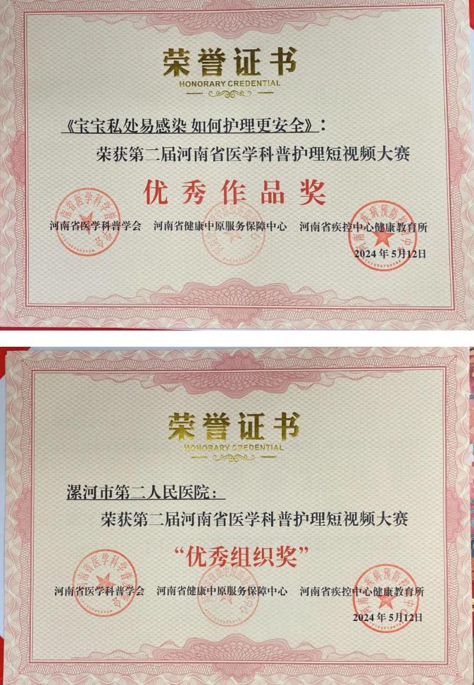 為慶祝113個(gè)國際護(hù)士節(jié),展示護(hù)理工作者的美好職業(yè)形象,引導(dǎo)公眾樹立正確的心理健康理念,5月8日,由河南省衛(wèi)生健康委宣傳處指導(dǎo),河南省醫(yī)學(xué)科普學(xué)會(huì)、河南省健康中原服務(wù)保障中心及河南省疾病預(yù)防控制中心健康教育所主辦的“第二屆河南省醫(yī)學(xué)科普護(hù)理短視頻大賽”在鄭州落下帷幕。本次比賽,市二院黨委高度重視,號召全院職工積極參與,征集優(yōu)秀護(hù)理科普短視頻,經(jīng)過積極籌備,廣泛動(dòng)員,共提交25部作品參賽。通過層層選拔,由張小玉、盧清麗、劉橋、王倩、陳星、劉曉燕護(hù)理團(tuán)隊(duì)拍攝的科普視頻《寶寶私處易感染 如何護(hù)理更安全》從全省18個(gè)地市442家醫(yī)療機(jī)構(gòu)2691部科普短視頻作品中脫穎而出,在本次大賽中榮獲優(yōu)秀獎(jiǎng)!同時(shí)醫(yī)院榮獲“優(yōu)秀組織獎(jiǎng)”!