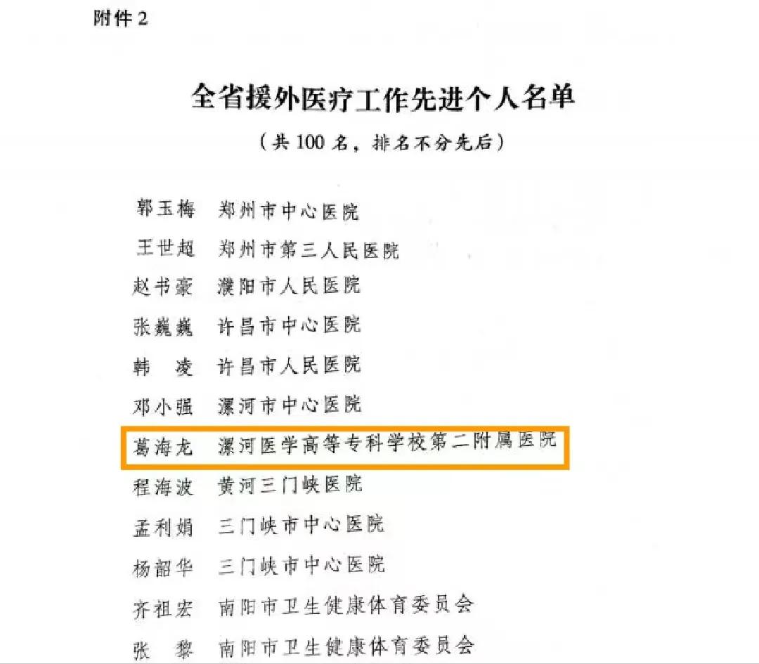 在紀(jì)念河南省承派援外醫(yī)療隊(duì)50周年的重要時(shí)刻,為表?yè)P(yáng)先進(jìn)、樹立楷模,省衛(wèi)生健康委隆重舉行紀(jì)念大會(huì),對(duì)包括援埃塞俄比亞中國(guó)醫(yī)療隊(duì)群體在內(nèi)的47個(gè)優(yōu)秀集體以及100名杰出個(gè)人進(jìn)行了通報(bào)表?yè)P(yáng)。其中,漯河市骨科醫(yī)院(漯河醫(yī)專二附院、漯河市立醫(yī)院)葛海龍榮獲全省援外醫(yī)療工作先進(jìn)個(gè)人!