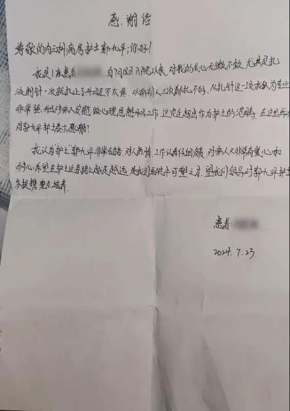病情穩(wěn)定后,患者及家屬特意送來感謝信,向心內(nèi)一科的全體醫(yī)務(wù)人員表達(dá)感謝。漯河市骨科醫(yī)院(漯河醫(yī)專二附院、漯河市立醫(yī)院)心血管內(nèi)科一病區(qū)(內(nèi)三科)始終以病人為中心,以專業(yè)的技術(shù)和細(xì)致入微的關(guān)懷提供優(yōu)質(zhì)醫(yī)療服務(wù),全力以赴為病人的健康保駕護航!(盧 闖 劉 旭 袁錦鈺)