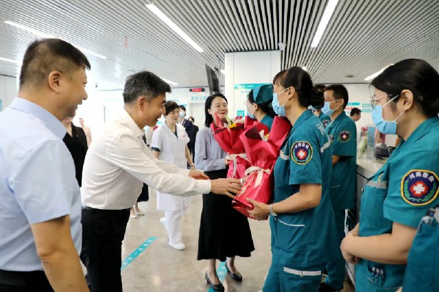 在急診科,宋耀生書記、于宏副主任向急救人員送上鮮花,對他們在急救救援和保障人民生命健康方面所做出的貢獻表示肯定。“急診科是衛(wèi)健系統(tǒng)和醫(yī)院的前沿陣地,你們時刻待命,聞令出擊,為患者救治爭分奪秒,大家辛苦了!”領(lǐng)導(dǎo)的話語溫暖著每一位急診醫(yī)師的心。