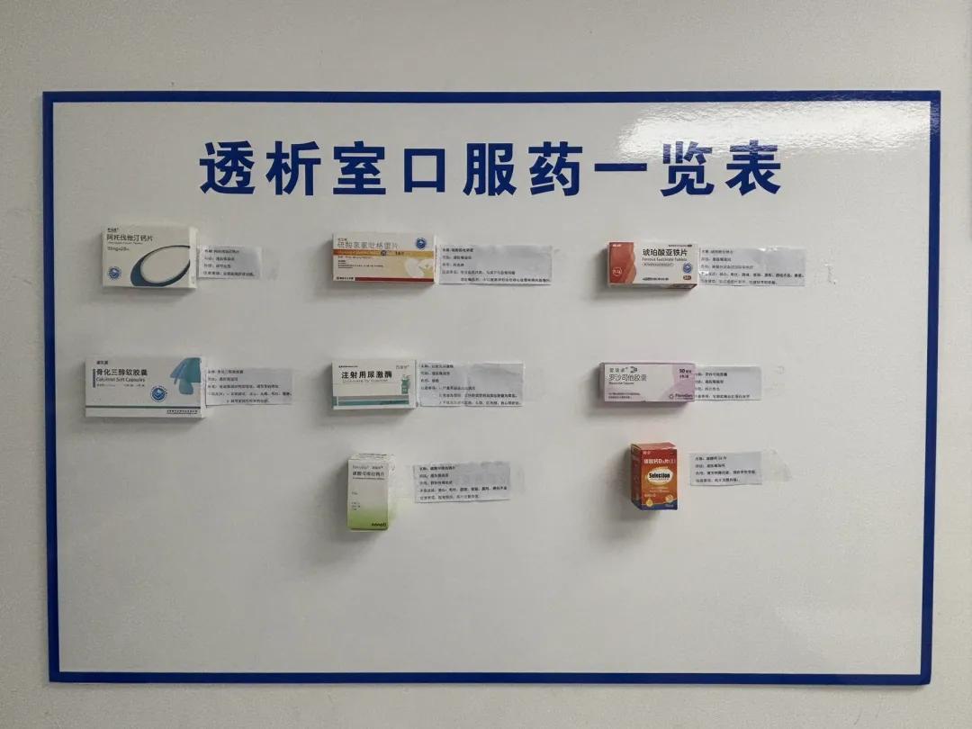隨著醫(yī)學(xué)技術(shù)的發(fā)展,高齡患者越來(lái)越多,即便醫(yī)護(hù)人員反復(fù)講解用藥方法,患者和家屬仍可能因記憶模糊、理解偏差導(dǎo)致用錯(cuò)藥。為了解決這一難題,血液凈化室推行 “口服藥上墻” 舉措,患者可以拿著自己藥盒與墻上的藥盒進(jìn)行一一對(duì)照。藥盒旁配有詳盡說(shuō)明,圖文并茂,直觀易懂,有效避免用藥誤區(qū),確?;颊哂盟幇踩嵘委熜Ч?。
