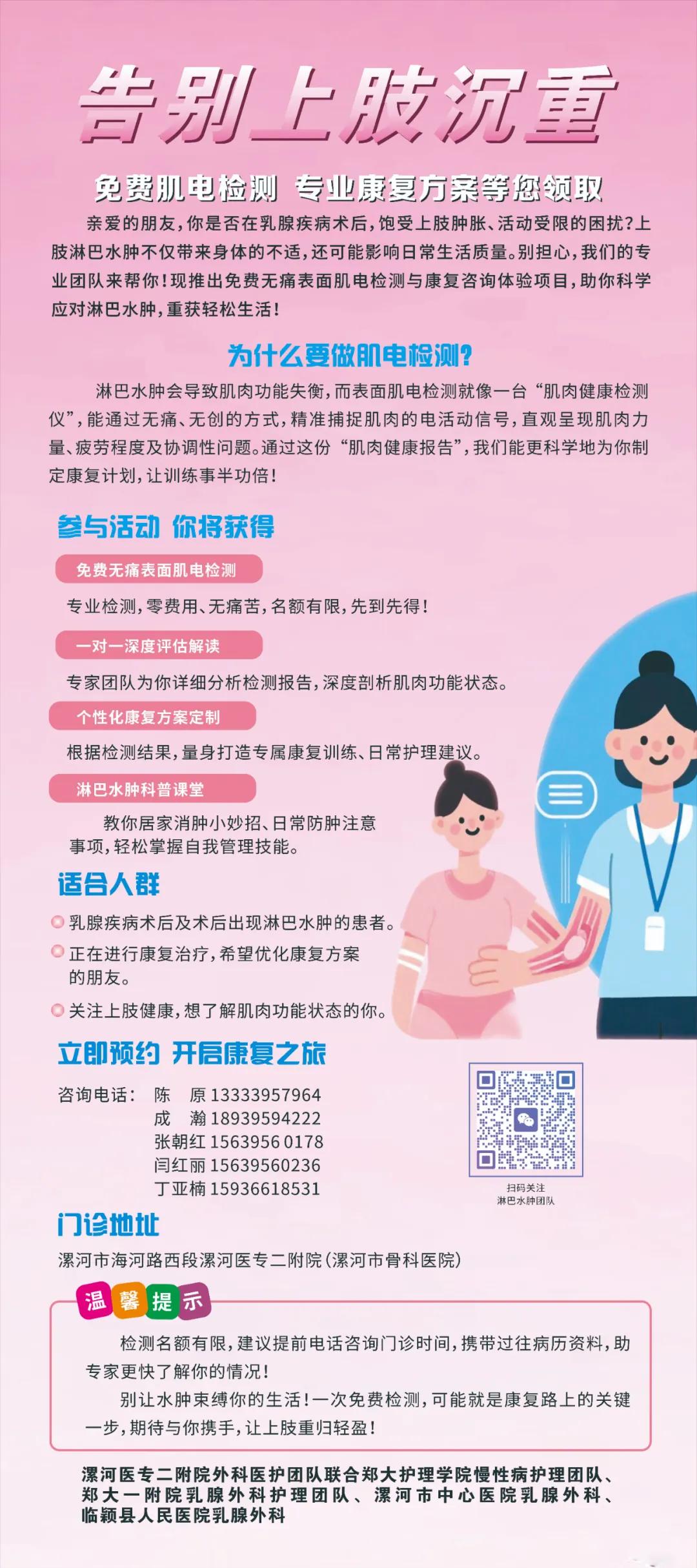 漯河醫(yī)專二附院聯(lián)合省市級(jí)多專家團(tuán)隊(duì)推出公益項(xiàng)目,于6月20日開(kāi)放免費(fèi)無(wú)痛檢測(cè)名額,含一對(duì)一報(bào)告解讀與康復(fù)指導(dǎo),助您科學(xué)應(yīng)對(duì)水腫困擾。立即致電咨詢預(yù)約,讓專業(yè)團(tuán)隊(duì)為您的上肢健康保駕護(hù)航!