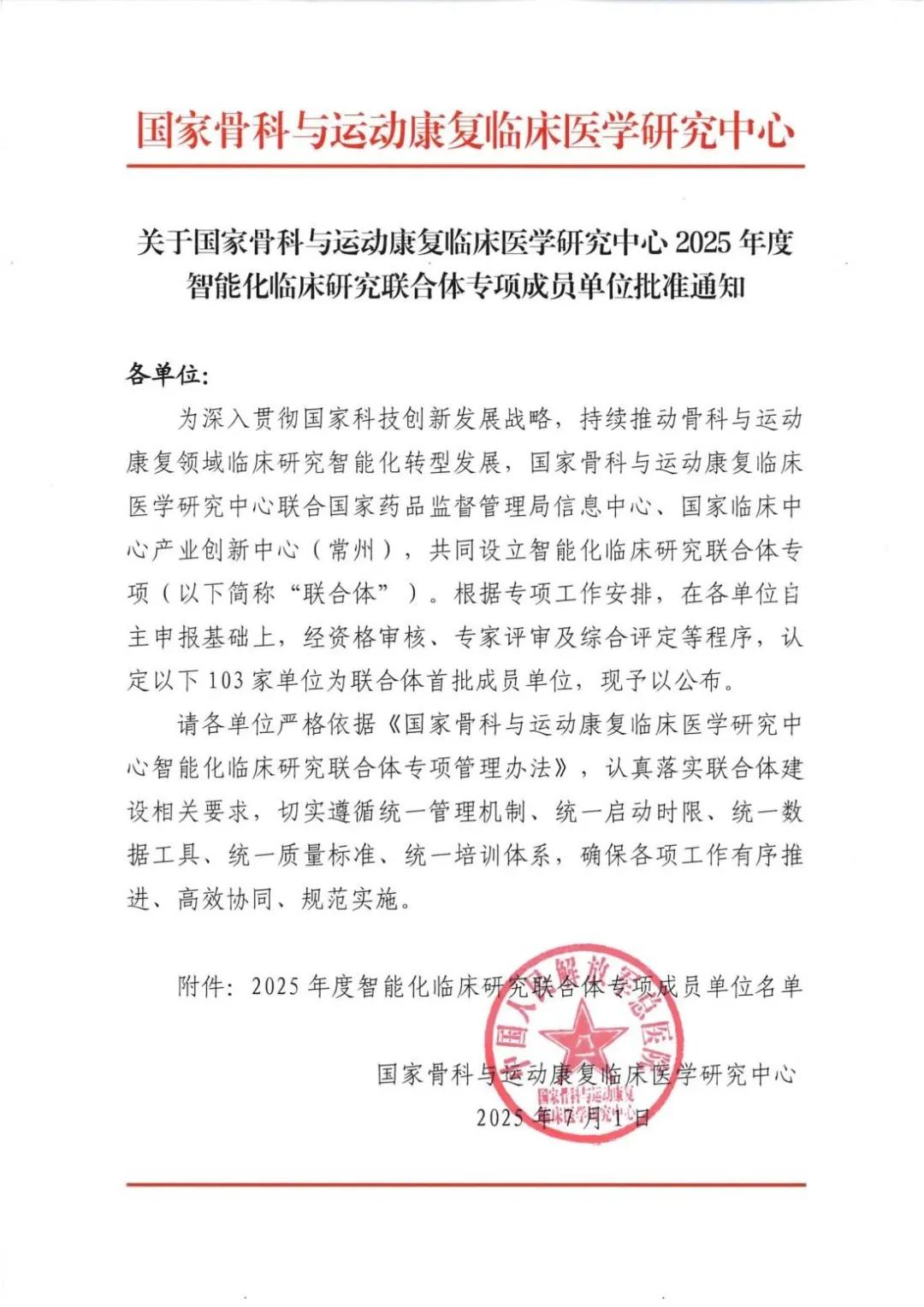 由國(guó)家骨科與運(yùn)動(dòng)康復(fù)臨床醫(yī)學(xué)研究中心(以下簡(jiǎn)稱“國(guó)家臨床中心”)聯(lián)合國(guó)家藥品監(jiān)督管理局信息中心、國(guó)家臨床中心產(chǎn)業(yè)創(chuàng)新中心(常州)共同設(shè)立的“2025年度智能化臨床研究聯(lián)合體專項(xiàng)”已完成首批成員單位遴選,共103家單位成功入選(具體名單見文末附件),覆蓋全國(guó)26個(gè)省份。 其中漯河醫(yī)專二附院成功入選國(guó)家臨床中心“智能化臨床研究聯(lián)合體專項(xiàng)”首批成員單位