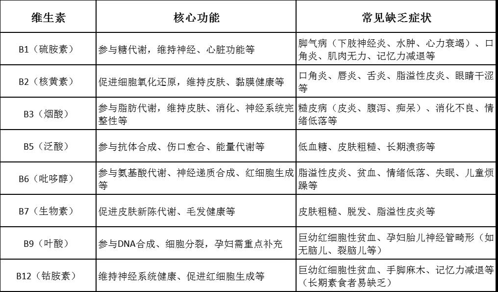 B族維生素是水溶性維生素家族,包括維生素B1(硫胺素)、B2(核黃素)、B3(煙酸)、B5(泛酸)、B6(吡哆醇)、B7(生物素)、B9(葉酸)、B12(鈷胺素)等8種人體必需成員。它們是糖、脂肪、蛋白質(zhì)代謝的關(guān)鍵輔酶構(gòu)成成分之一,參與神經(jīng)系統(tǒng)功能、皮膚健康、紅細(xì)胞生成等多個(gè)生理過(guò)程,缺乏會(huì)導(dǎo)致多系統(tǒng)疾病。