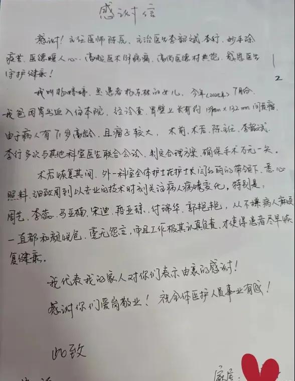 這封感謝信,是對(duì)普通外科全體醫(yī)護(hù)人員,尤其是對(duì)護(hù)理團(tuán)隊(duì)辛勤付出和專業(yè)精神的高度認(rèn)可與鼓勵(lì)。對(duì)團(tuán)隊(duì)而言,患者的康復(fù)和家屬的滿意是他們最大的追求。普通外科團(tuán)隊(duì)將繼續(xù)秉承“以患者為中心”的服務(wù)理念,不斷精進(jìn)醫(yī)療技術(shù),提升護(hù)理服務(wù)質(zhì)量,尤其是加強(qiáng)復(fù)雜、高齡患者圍手術(shù)期的精細(xì)化、人性化護(hù)理管理,用精湛的醫(yī)術(shù)祛除病痛,用溫暖的仁心守護(hù)健康,為更多患者帶來康復(fù)的希望和家的溫暖。(盧 闖 閆紅麗 劉 旭 袁錦鈺)