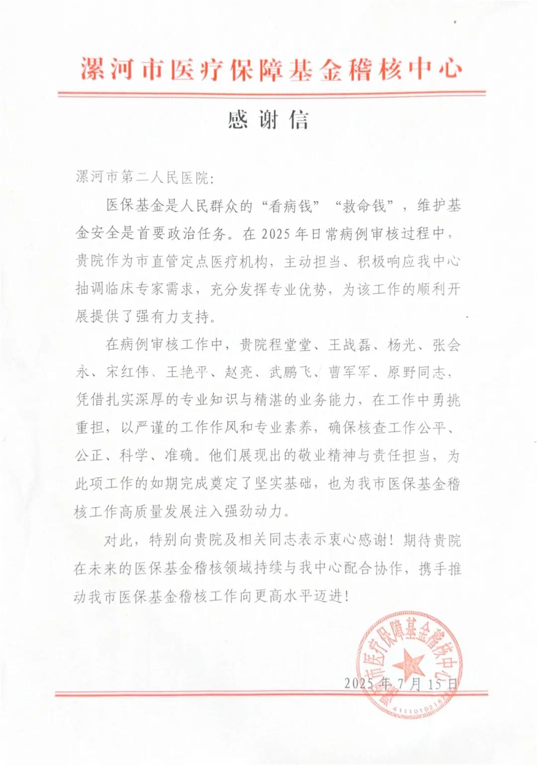 近日,市醫(yī)療保障基金稽核中心向市二院發(fā)來感謝信,對醫(yī)院選派多名業(yè)務骨干協(xié)助開展2025年日常病例審核工作表示感謝,信中高度評價市二院專家團隊以扎實的臨床功底和嚴謹?shù)墓ぷ髯黠L,高效完成病例合規(guī)性審查,為醫(yī)?;鸨O(jiān)管提供重要技術支持,并對醫(yī)院長期以來在醫(yī)保政策落實、醫(yī)療質量管控方面的工作成效給予充分肯定。