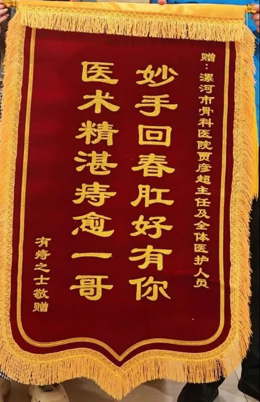近日,漯河醫(yī)專二附院(漯河市骨科醫(yī)院、漯河市立醫(yī)院)肛腸科收到一面滿載心意的錦旗?;颊呶罩Z彥超主任的手再三致謝,錦旗上“妙手回春肛好有你,醫(yī)術(shù)精湛痔愈一哥”十六個(gè)大字,既是對(duì)醫(yī)護(hù)人員專業(yè)能力的肯定,更是對(duì)肛腸科中西醫(yī)結(jié)合診療水平的認(rèn)可。