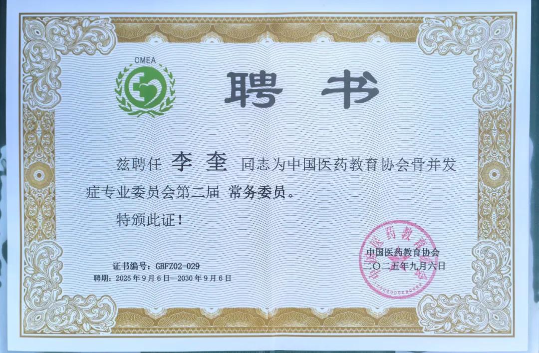 漯河醫(yī)專二附院名譽院長李奎教授獲聘中國醫(yī)藥教育協(xié)會骨并發(fā)癥專業(yè)委員會常務(wù)委員