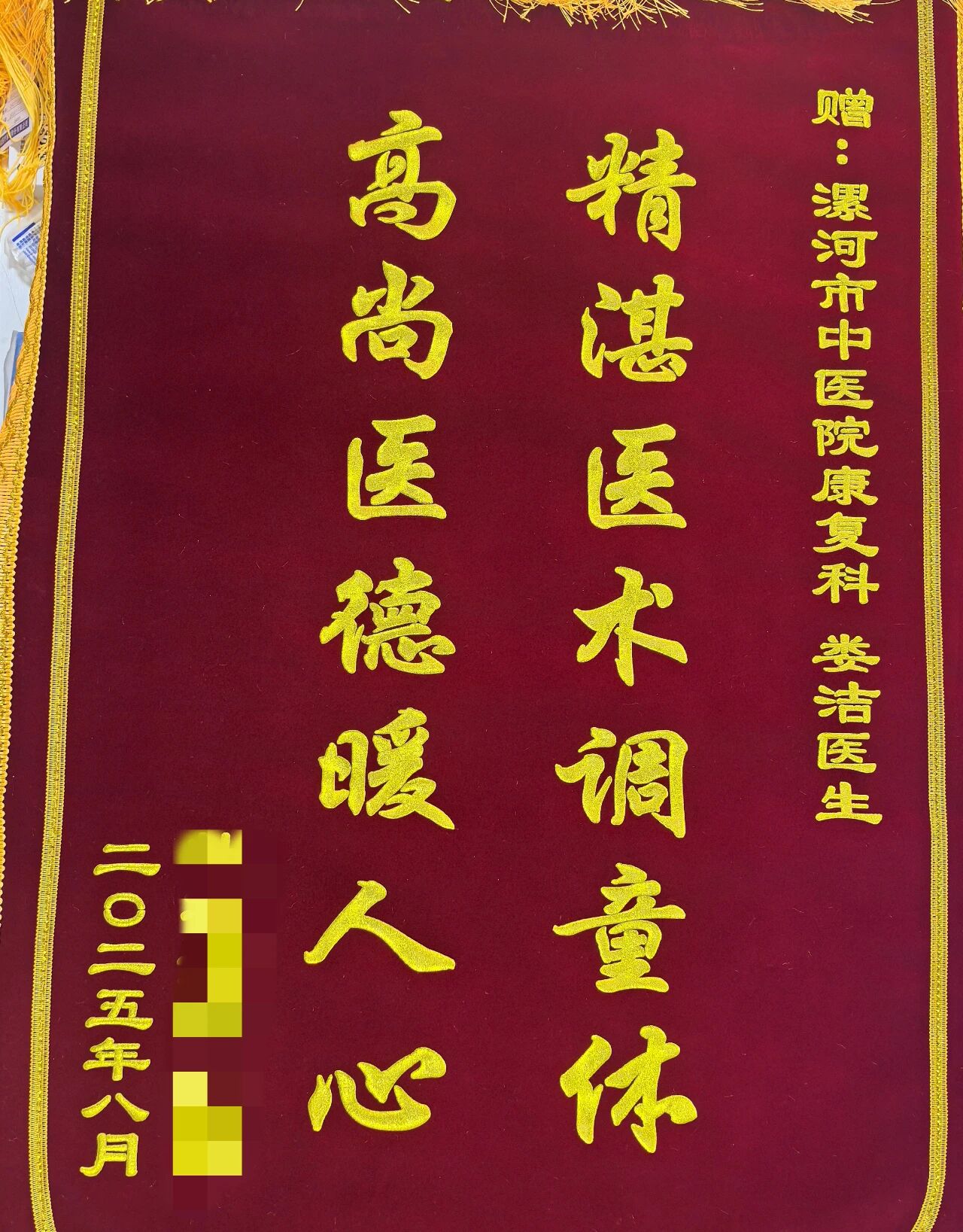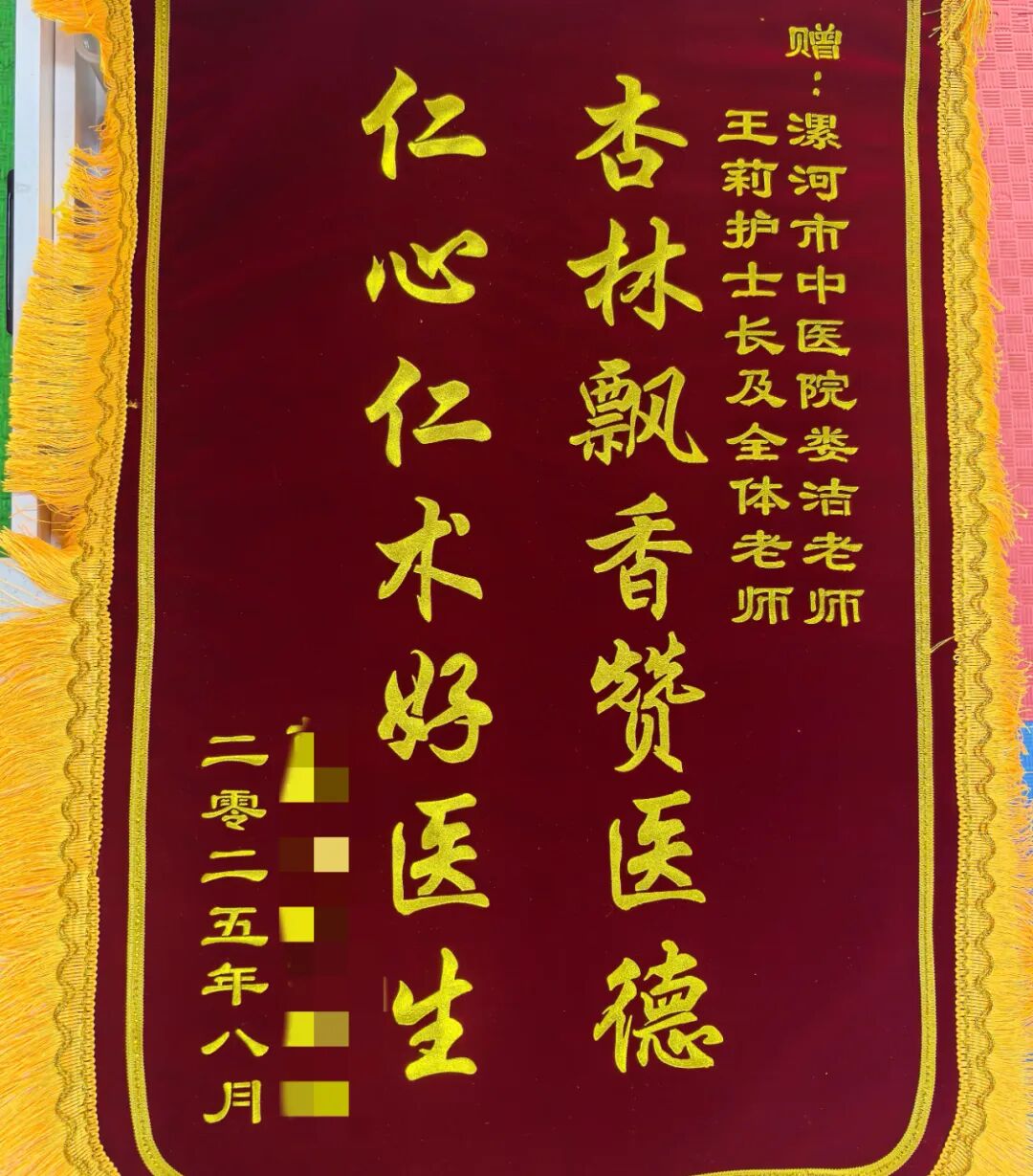 近日,漯河市中醫(yī)院兒童康復(fù)科收到患兒家屬贈送的兩面錦旗,分別寫有 “杏林飄香贊醫(yī)德,仁心仁術(shù)好醫(yī)生”“精湛醫(yī)囑調(diào)童體,高尚醫(yī)德暖人心”。家屬以此表達(dá)對婁潔醫(yī)生、王莉護(hù)士長及治療師精湛技術(shù)和優(yōu)質(zhì)服務(wù)的肯定與感謝。