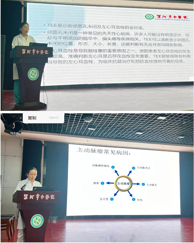 本次活動(dòng)特別邀請超聲科專家團(tuán)隊(duì)現(xiàn)場授課,其中副主任醫(yī)師許淑君、王珂,副主任技師劉慧,主治醫(yī)師郭亞蘭及住院醫(yī)師付豪分別主講,內(nèi)容圍繞五大核心板塊展開:經(jīng)食道超聲心動(dòng)圖的臨床應(yīng)用、經(jīng)食道超聲心動(dòng)圖指南解讀、人工瓣置換術(shù)后的超聲評估、心臟瓣膜病的超聲診斷,以及主動(dòng)脈疾病的超聲診斷。