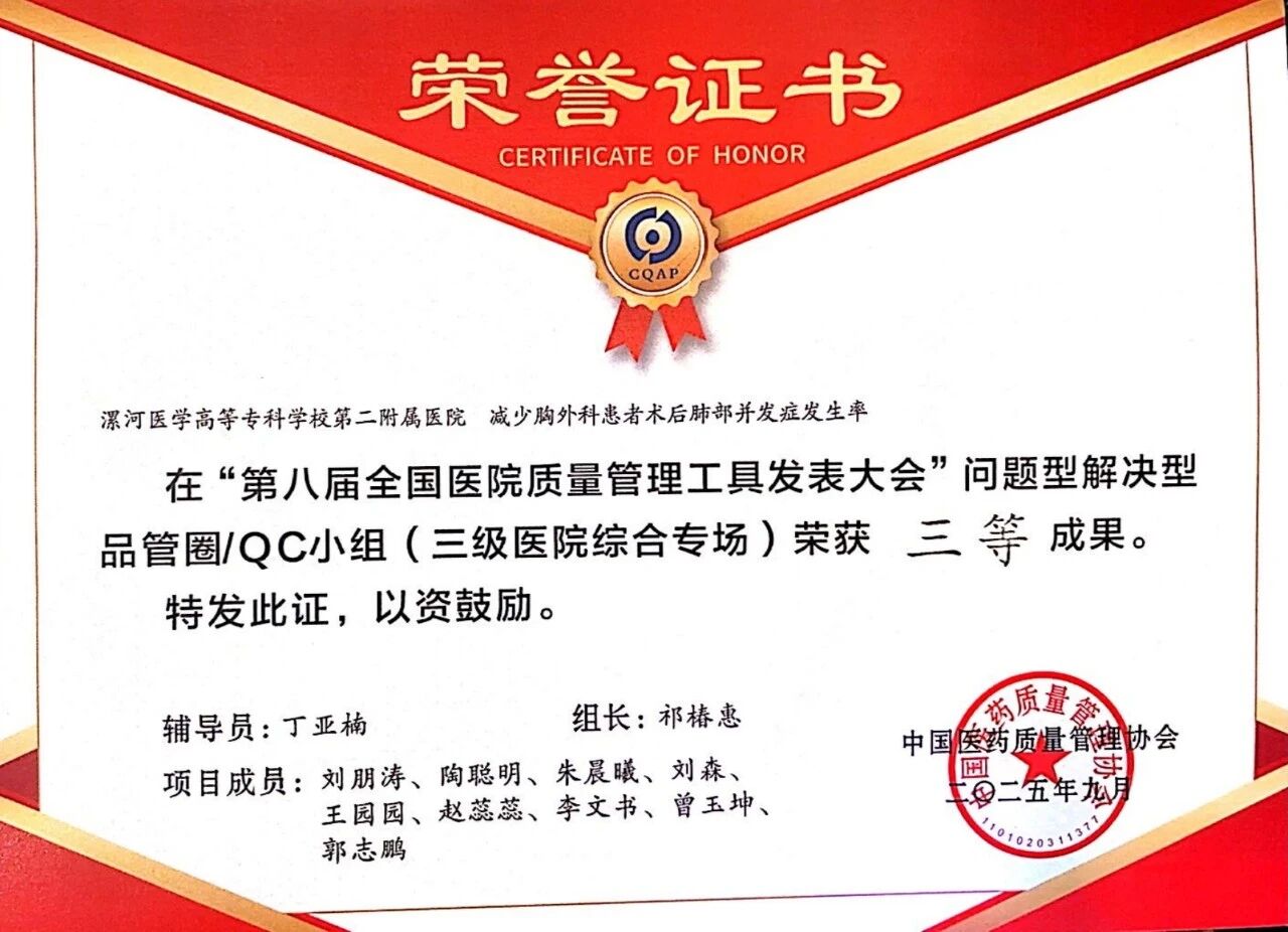 近日,第八屆醫(yī)院質(zhì)量管理工具應(yīng)用成果發(fā)表大會(huì)在重慶落幕。此次大賽共有來(lái)自全國(guó)的600多項(xiàng)課題參賽,其中413個(gè)項(xiàng)目入圍決賽,競(jìng)爭(zhēng)激烈。 漯河醫(yī)專二附院(漯河市骨科醫(yī)院、漯河市立醫(yī)院)關(guān)節(jié)外科選送的RCA項(xiàng)目與胸外科選送的"非常好圈"品管圈項(xiàng)目,在各自專場(chǎng)中展現(xiàn)了扎實(shí)的專業(yè)素養(yǎng),最終在眾多優(yōu)秀團(tuán)隊(duì)中勝出,分別斬獲二等獎(jiǎng)和三等獎(jiǎng)。