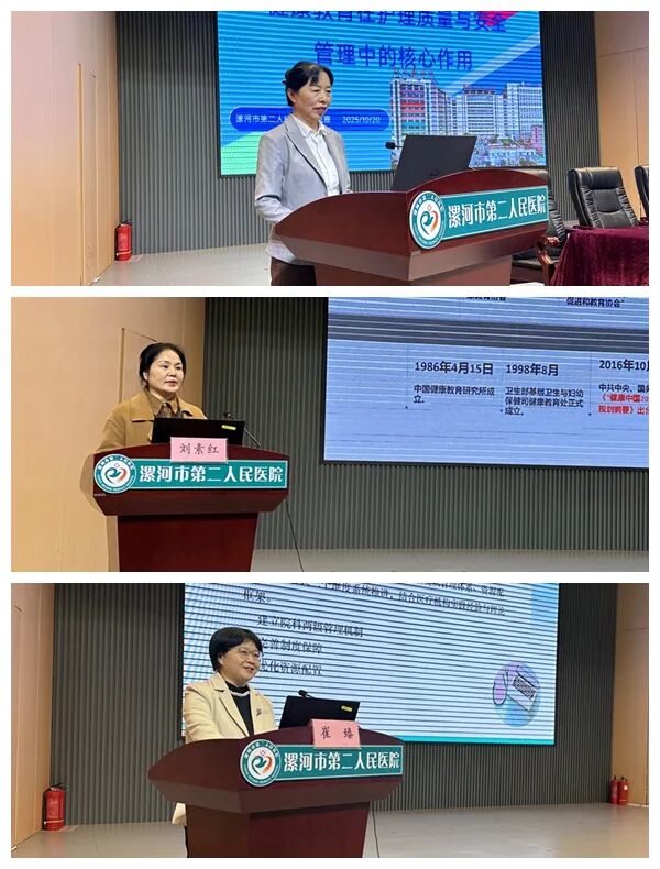 在學術交流環(huán)節(jié),多位護理專家圍繞健康教育的新理念、新方法與新技術展開深入探討。市二院護理部主任高凱霞分享了《健康教育在護理質(zhì)量與安全管理中的核心作用》;市中心醫(yī)院護理部副主任劉素紅講解了《基于賦能理論構(gòu)建三級醫(yī)院健康教育護士健康素養(yǎng)提升路徑》;市六院護理部副主任崔臻以《賦能·融合——構(gòu)建新時代醫(yī)院護理健康教育體系的實踐與思考》為題進行交流;臨潁縣人民醫(yī)院護理部副主任張潁歌介紹了《基于行為窗口理論的護士高效能溝通技巧》;市二院普外科護士長王書霞圍繞《腫瘤患者營養(yǎng)與身心健康:吃出健康,動出活力》展開講解;麻醉手術部副護士長莫敬敬探討了《基于指南的靜脈治療健康教育及溝通模式》;小兒外科骨干護士張小玉則就《智能時代,如何讓健康科普“活”起來?——AI在護理領域的創(chuàng)新實踐》進行分享。專家們結(jié)合臨床實例,展示了健康教育的最新成果與實踐經(jīng)驗,內(nèi)容充實,視角多元,為參會者帶來深刻啟發(fā)。