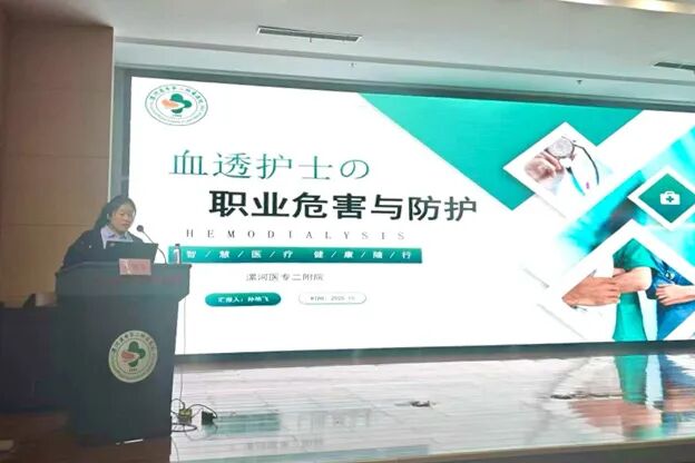 漯河醫(yī)專二附院血液凈化室骨干孫艷飛圍繞《血透護(hù)士的職業(yè)危害與防護(hù)》展開講解,從各個(gè)層面系統(tǒng)梳理了血透護(hù)士面臨的職業(yè)風(fēng)險(xiǎn),并提出了具體、可行的防護(hù)措施與建議,呼吁在全力關(guān)愛患者的同時(shí),務(wù)必重視自身的職業(yè)安全與身心健康,體現(xiàn)了深刻的人文關(guān)懷精神和團(tuán)隊(duì)管理智慧。由臨潁縣中醫(yī)院血液凈化室護(hù)士長(zhǎng)陳莉與舞陽(yáng)縣中醫(yī)院血液凈化室護(hù)士長(zhǎng)張銳主持會(huì)議。