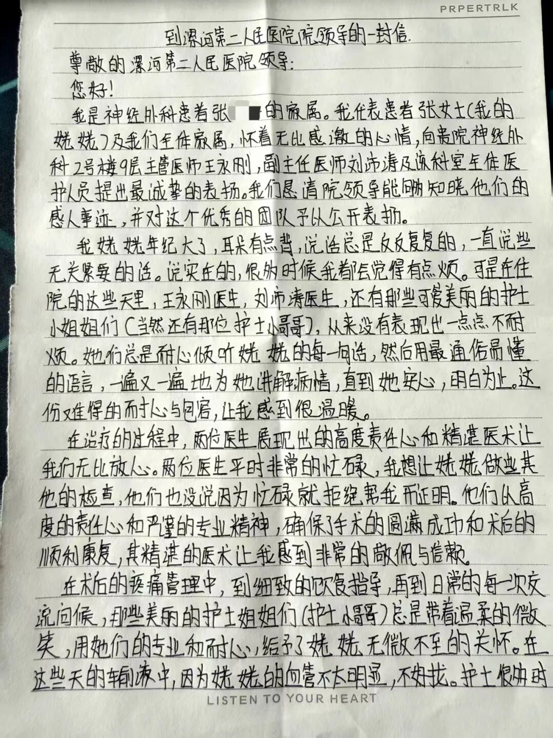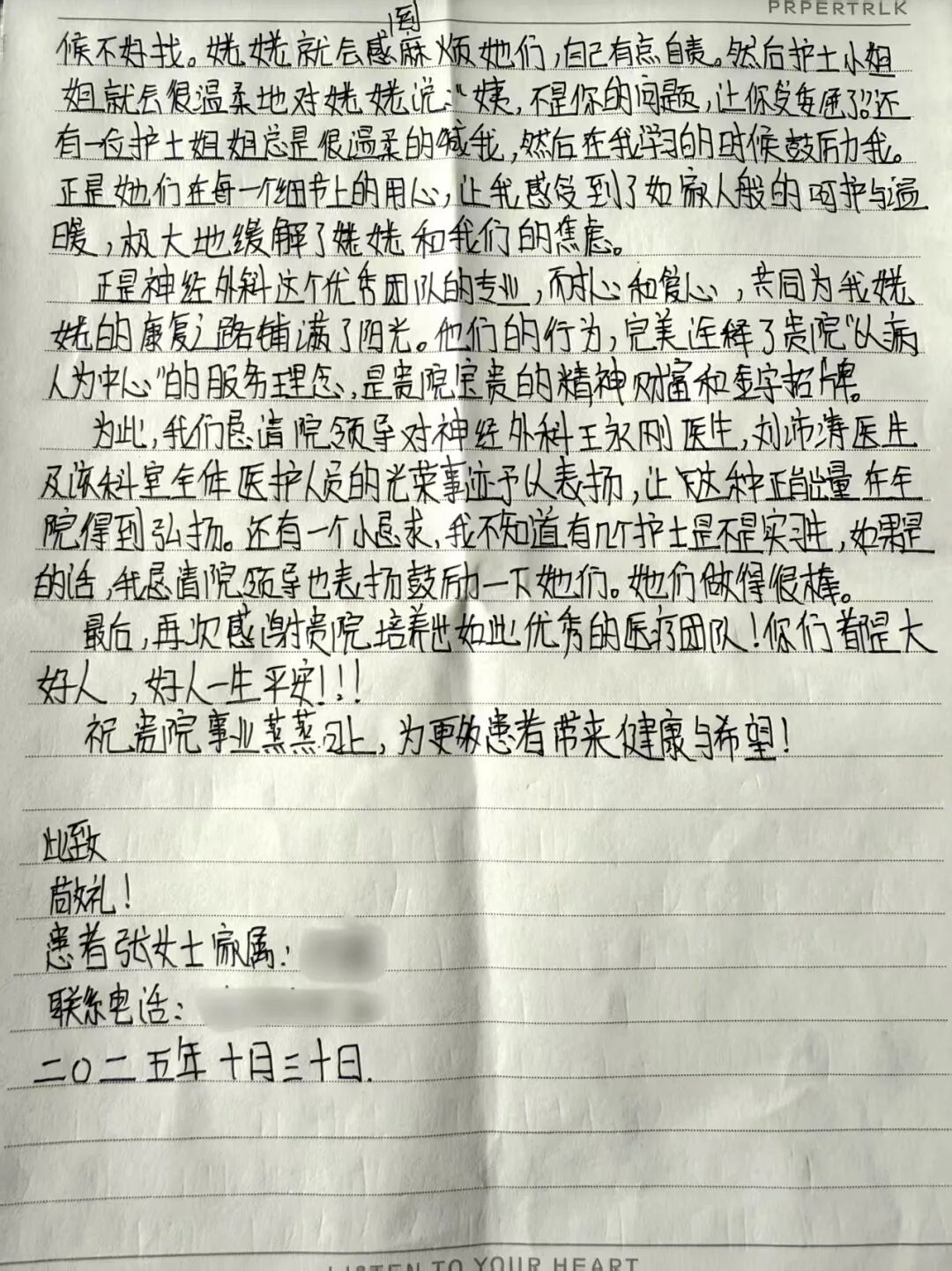 據(jù)了解,張女士的姥姥因“背部腫物”一直備受困擾,6年前在其他醫(yī)院手術(shù)治療后效果不佳,1年內(nèi)復(fù)發(fā),腫物逐漸增大,并出現(xiàn)肩部活動(dòng)受限伴肩部疼痛。來到市二院后神經(jīng)外科醫(yī)生立即進(jìn)行手術(shù),因術(shù)中腫物與周圍組織粘連嚴(yán)重,手術(shù)歷時(shí)近2個(gè)小時(shí),術(shù)后恢復(fù)良好。“我的姥姥年紀(jì)大了,耳朵有點(diǎn)背,說話總是反反復(fù)復(fù),啰啰嗦嗦的。說實(shí)在的,有時(shí)候我都會(huì)覺得有點(diǎn)煩??墒菑淖≡阂詠?,劉沛濤主任、王永剛醫(yī)生,還有那些美麗可愛的護(hù)士小姐姐們和帥氣的護(hù)士小哥哥,從來沒有表現(xiàn)出一點(diǎn)點(diǎn)不耐煩。他們總是耐心地聽姥姥講,一遍遍地解釋給她聽,直到她聽懂為止。”張女士的表揚(yáng)信中字里行間包含著對(duì)神經(jīng)外科整個(gè)醫(yī)護(hù)團(tuán)隊(duì)暖心服務(wù)的認(rèn)可與贊美。