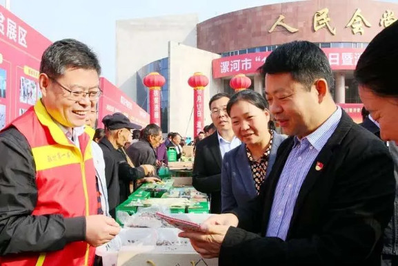 郭紅福(左)在漯河市消費扶貧活動啟動儀式上為貧困戶產品代言
