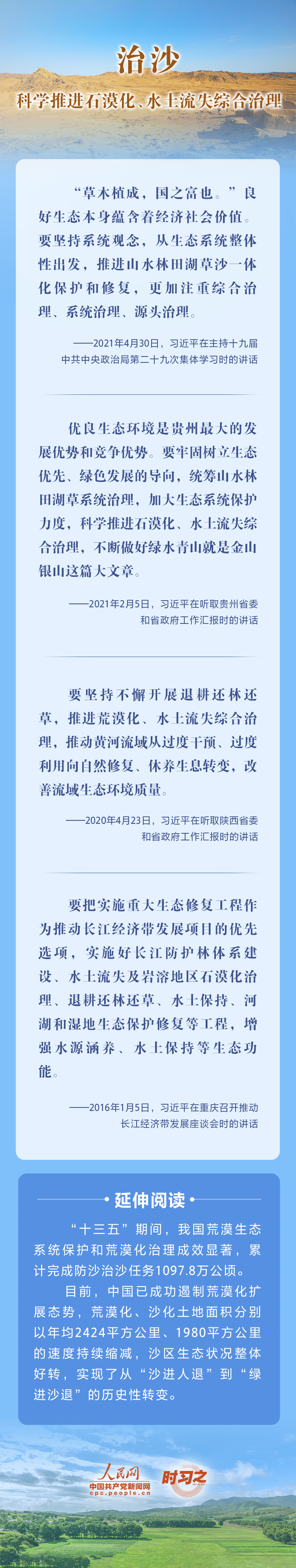 2022年6月17日是第二十八個(gè)世界防治荒漠化與干旱日?;哪侨蛎媾R的重大生態(tài)問題,黨的十八大以來,在習(xí)近平生態(tài)文明思想的指引下,我國(guó)荒漠化防治工作開辟了新境界、邁上了新臺(tái)階。讓我們一起從總書記的重要論述里學(xué)習(xí)領(lǐng)悟中國(guó)踐行綠色發(fā)展理念,堅(jiān)定走好荒漠化防治之路的決心。