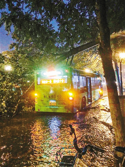 8月18日傍晚強降雨過程中,市區(qū)洪河路與嵩山路交叉口附近一棵楊樹折斷,砸到一輛經(jīng)過的105路公交車和一輛轎車,幸無人員受傷。