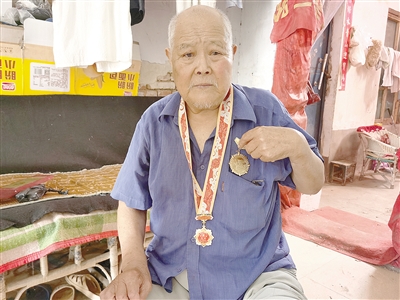 劉付強(qiáng)老人有一個(gè)珍藏的袋子,里面放著他的各種證件和國家為他發(fā)放的慶祝中華人民共和國成立70周年紀(jì)念章。