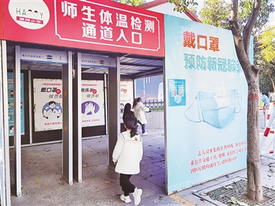 11月9日,在漯河小學(xué)門口,記者看到學(xué)校大門處設(shè)置了電子測(cè)溫通道,校門口有交警、老師和保安維持秩序。聽(tīng)到電子測(cè)溫通道傳出“體溫正常”后,學(xué)生們有序進(jìn)入校園。到位的疫情防控措施讓家長(zhǎng)們很是安心,把孩子放在學(xué)校門口后,便快速離開(kāi)了。