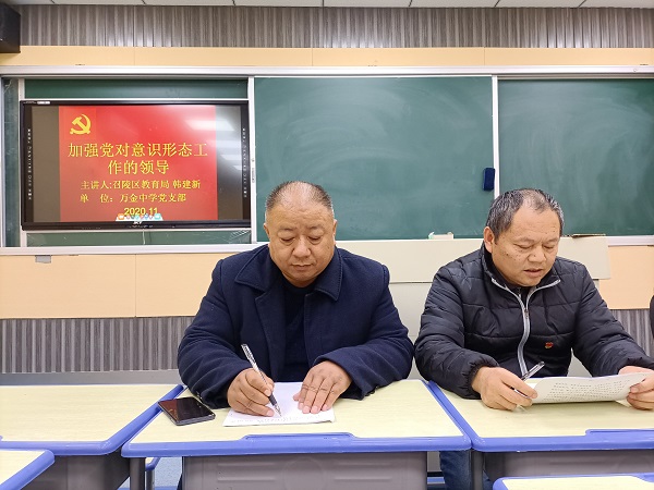 為加強黨對意識形態(tài)工作的領導,穩(wěn)固基層黨員教師的意識形態(tài)工作,11月30日下午,召陵區(qū)教育局韓建新同志,在萬金中學東校區(qū),給萬金鎮(zhèn)全體黨員教師上了《加強和改進黨對意識形態(tài)工作的領導》的思政課,此次會議由萬金中學黨支部副書記張曉斌同志主持。