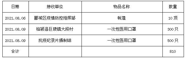 截止到8月16日20時(shí),漯河市新冠肺炎疫情防控指揮部累計(jì)收到社會(huì)捐贈(zèng)款物價(jià)值13,661,498.4元,其中捐贈(zèng)物資價(jià)值5,575,623.88元,現(xiàn)將接受社會(huì)捐贈(zèng)款物支出分配情況公示如下: