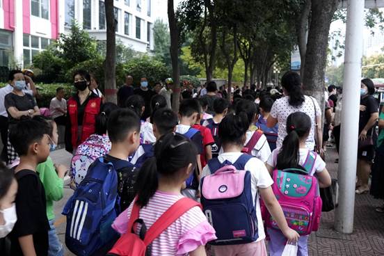 18點(diǎn)15分,錯峰放學(xué)的三、四年級學(xué)生按照南北兩隊(duì)分別從學(xué)校南北兩個大門走出,行至各自的接送點(diǎn)。18點(diǎn)30分,最后放學(xué)的高年級學(xué)生也分成兩隊(duì)走出校門,18點(diǎn)40分,全校學(xué)生全部有序離校,沒有擁堵現(xiàn)象發(fā)生。