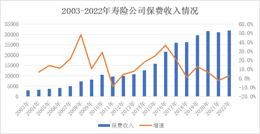 剛剛過去的2022年,我國人身險公司保費收入達到了3.2萬億,而在2003年,人身險公司整體保費還不足3000億,過去20年,我國人身險公司保費規(guī)模增長了10倍,復(fù)合增長率超過了13%。在此期間,我國的GDP也從2003年的13.74萬億增長到2022年末的121.02萬億,復(fù)合增長率也超過了12%??梢钥闯?,過去20年,人身險公司的保費增長和GDP的增長基本吻合,這也符合人身險業(yè)務(wù)的發(fā)展規(guī)律。隨著國家經(jīng)濟實力的增強,國民收入的提高,人們對保險的需求進入到了一個新的增長階段,也為國內(nèi)的人身險公司送來了發(fā)展的東風(fēng)。