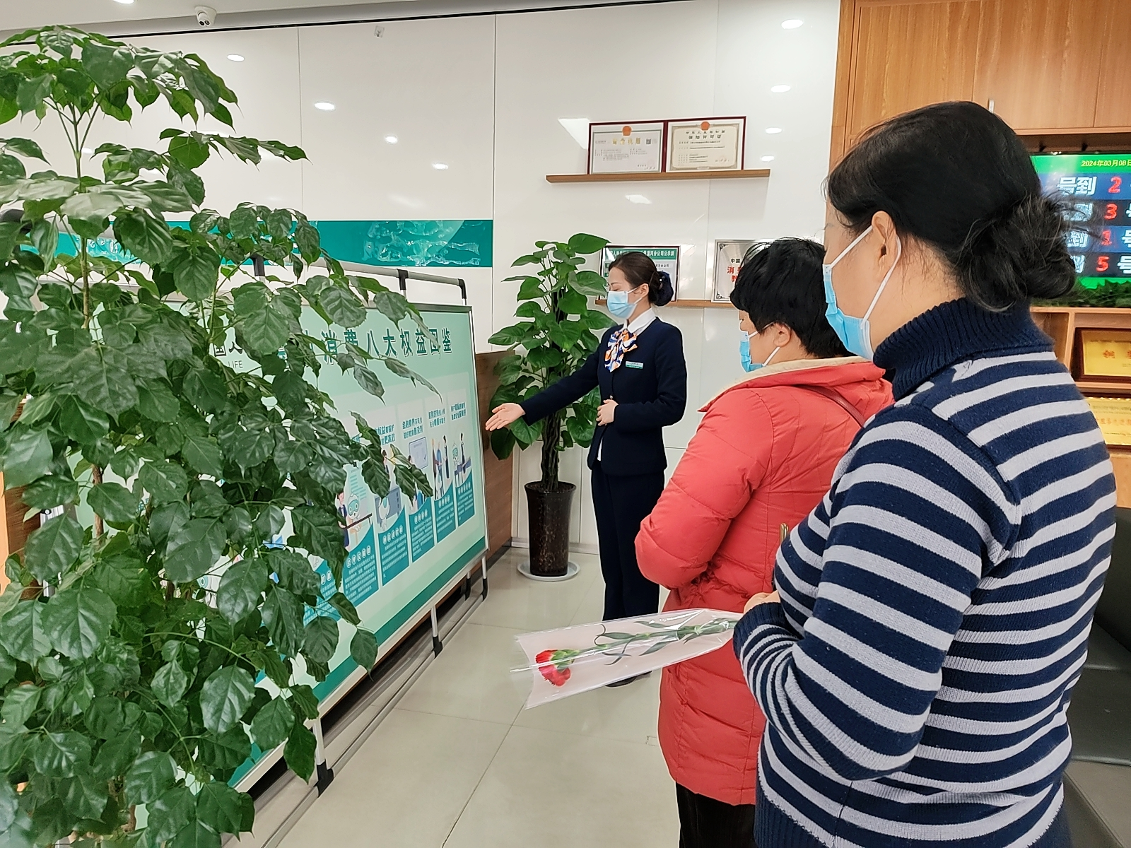 活動當天營業(yè)廳為到場的女性客戶獻上康乃馨,表達節(jié)日的問候和祝?!,F(xiàn)場推出了消保知識競猜活動,參加活動的客戶從鮮花墻上抽題答題并贈送了禮品,不僅活躍了節(jié)日氣氛,又為客戶普及了金融消費者權益知識,提高客戶風險防范意識。