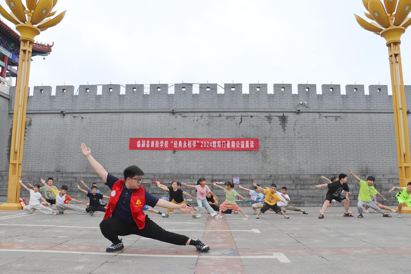 “沖拳!一,哈!二,哈!……”清晨,在漯河市臨潁縣南街村朝陽門廣場激蕩著響亮的口號聲,這聲音整齊劃一、鏗鏘有力,伴隨著氣勢十足的聲音,只見孩子們做出馬步、穿掌、沖拳、踢腿等經(jīng)典的武術(shù)招式,動作有力,虎虎生風。