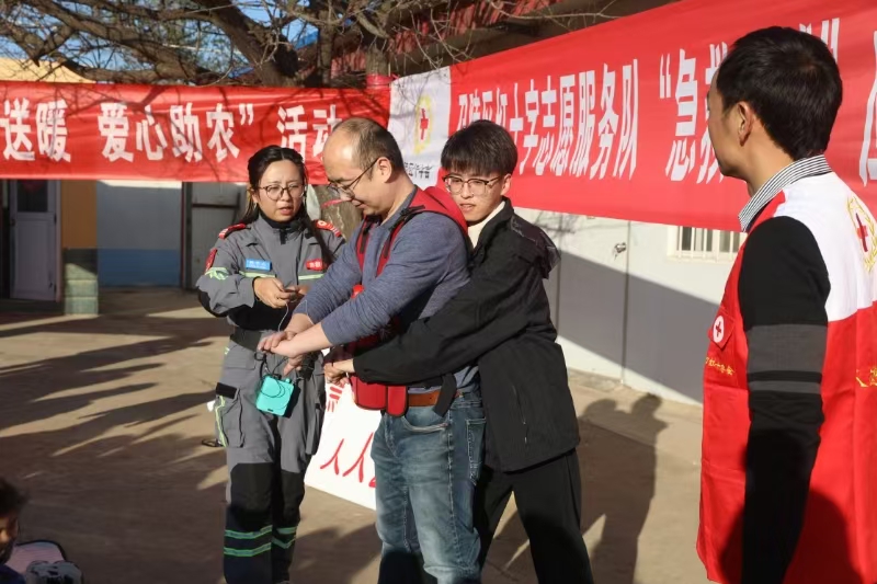首先進(jìn)行“急救地?cái)?rdquo;應(yīng)急救護(hù)演練,區(qū)紅十字志愿者們攜帶急救設(shè)備,現(xiàn)場(chǎng)演示急救技能,通過(guò)“大手拉小手”的方式,家長(zhǎng)和孩子們一起練習(xí)急救自救互救技能。
