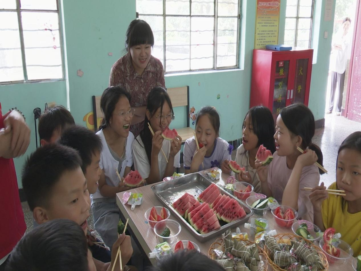 在三家店鎮(zhèn)高宗寨村兒童之家,鎮(zhèn)村干部們一早便忙活開來。他們精心準備了粽子、果凍,將鎮(zhèn)內(nèi)特色農(nóng)產(chǎn)品西紅柿、黃瓜、西瓜洗凈切片,撒上白糖,制成飽含愛意的美食?;顒蝇F(xiàn)場,孩子們圍坐在一起,伴隨著稚嫩的童聲合唱《小星星》,品嘗著酸甜可口的西紅柿、清爽多汁的果蔬拼盤和軟糯香甜的粽子,歡聲笑語此起彼伏。"太好吃啦!紅紅的西紅柿、圓圓的大西瓜、脆脆的黃瓜,還有甜甜的粽子,比我以前吃過的都好吃!我太喜歡了",高宗寨小學學生宋夢凡開心地分享著感受。鎮(zhèn)村干部們一邊與孩子們品嘗美食,一邊親切詢問學習生活情況,用實際行動傳遞溫暖關(guān)懷。