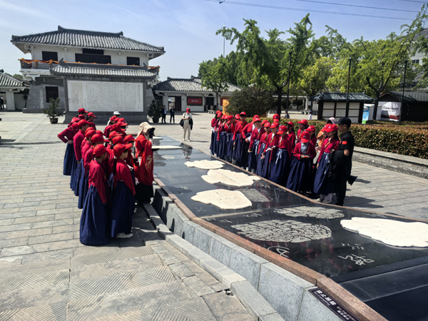 五一期間,許慎文化園,孩子們?cè)跐h字大道旁認(rèn)真傾聽講解