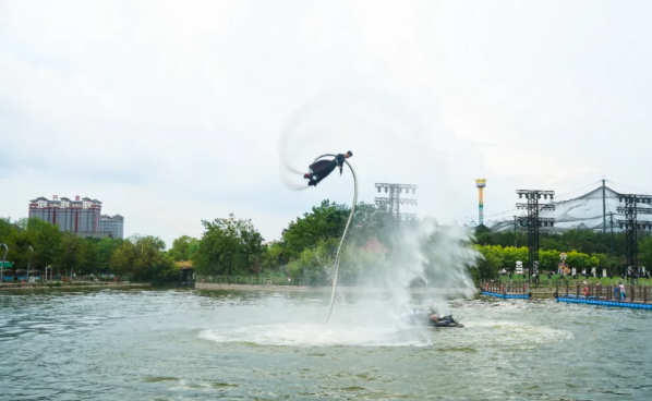 水上表演更是精彩絕倫?!丢?dú)竹水上漂》節(jié)目中,表演者們腳踩楠竹,在水面上輕盈滑行,仿佛在水上飛舞,引得觀眾們驚嘆不已?!端巷w人》的表演者們借助噴水裝置在空中翻轉(zhuǎn)騰挪,如同超人般翱翔于水面之上;而《水上火壺》則將傳統(tǒng)藝術(shù)與現(xiàn)代科技完美結(jié)合,火光與水花交相輝映,震撼的視覺效果讓觀眾們?nèi)滩蛔“l(fā)出陣陣喝彩和尖叫。鳳棲湖劇場內(nèi),大型舞臺(tái)劇《時(shí)空奇緣》的現(xiàn)場排練預(yù)演同樣精彩,演員們精湛的表演和動(dòng)人的故事引得觀眾掌聲雷動(dòng),沉浸其中。