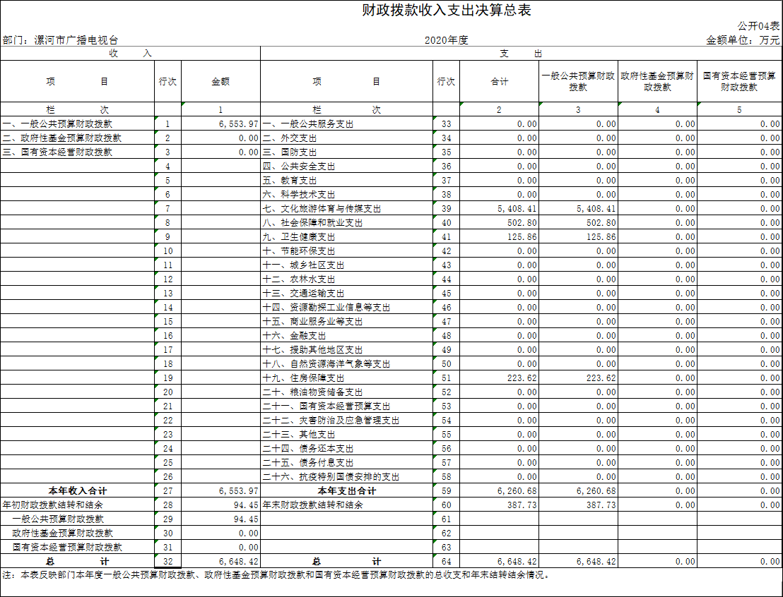 2020年度財政撥款收、支總計均為6648.42萬元。與上年度相比,財政撥款收、支總計各減少997.73萬元,下降13.05%。主要原因是廣告收入下降;機構(gòu)改革,人員減少。