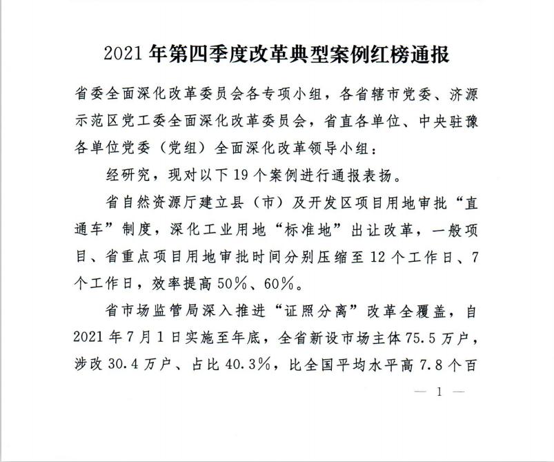 河南省2021年第四季度改革典型案例紅榜通報(bào)