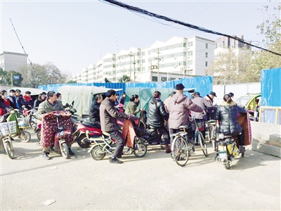 11月30日下午1點,記者來到解放路南段東貨場處的鐵路道口北側,看到鐵道已經(jīng)被藍色圍擋圍了起來,在靠東側的位置留了一個寬約2米的出入口。在出入口處,擠擠攘攘地圍著20多輛電動車、三輪車、老年代步車等車輛,車主或坐在車上,或下車等待,耐心地等待著能夠通行。一些沒有耐心的車主,選擇調(diào)頭繞行,還有個別車主拿出手機打發(fā)時間。在鐵道口南側,等待通行的行人、車輛則排起了長隊。