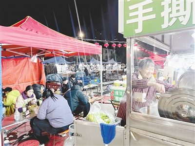 最吸引消費(fèi)者的當(dāng)屬熱乎乎的麻辣面攤位。攤位旁邊的小桌子座無虛席,還有不少顧客選擇打包帶走。“這幾天溫度比較低,但是來吃手撕面的顧客仍然不少。一般傍晚六七點(diǎn)會迎來一波就餐高峰。有時候晚上11點(diǎn)還有人來這里吃上一碗面。我們通常營業(yè)到深夜12點(diǎn)。忙起來確實(shí)辛苦,但是和家人一起做生意的日子也很幸福。”經(jīng)營麻辣面攤位的黨阿姨告訴記者。